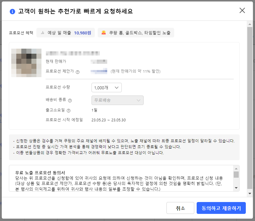 당사는 위 프로모션 신청이 프로모션 참여를 100% 보장하는 것이 아니고, 가격, 재고량, 배송비 조건, 기존 매출 규모 등을 고려하여 승인 여부가 결정되는 점을 인지하고 있으며, 위 신청 내용은 관련 설명을 숙지한 후 당사의 자발적인 의지에 의해 작성된 것입니다. 당사는 프로모션 신청 상품이 오늘의 할인(홈), 골드박스, 타임할인 및 카테고리 홈 영역 중 하나에 노출될 수 있고, 이는 귀사가 해당 상품의 특성을 고려하여 결정하는 점, 프로모션 참여가 확정되면 프로모션 개시일에 재고, 가격 및 배송비 조건 등 해당 상품 판매조건이 당사가 작성한 내용으로 업데이트되는 점에 동의합니다.