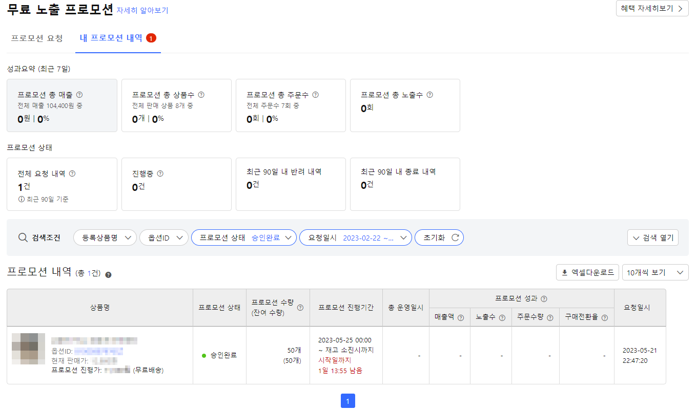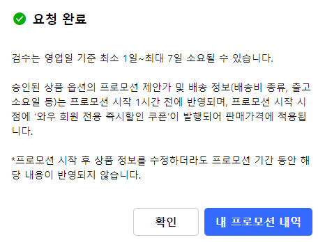 심사 기간은 영업일 기준 최소 1일, 최장 7일까지 소요될 수 있습니다. 내 프로모션 내역에서 심사 내용을 확인할 수 있습니다.